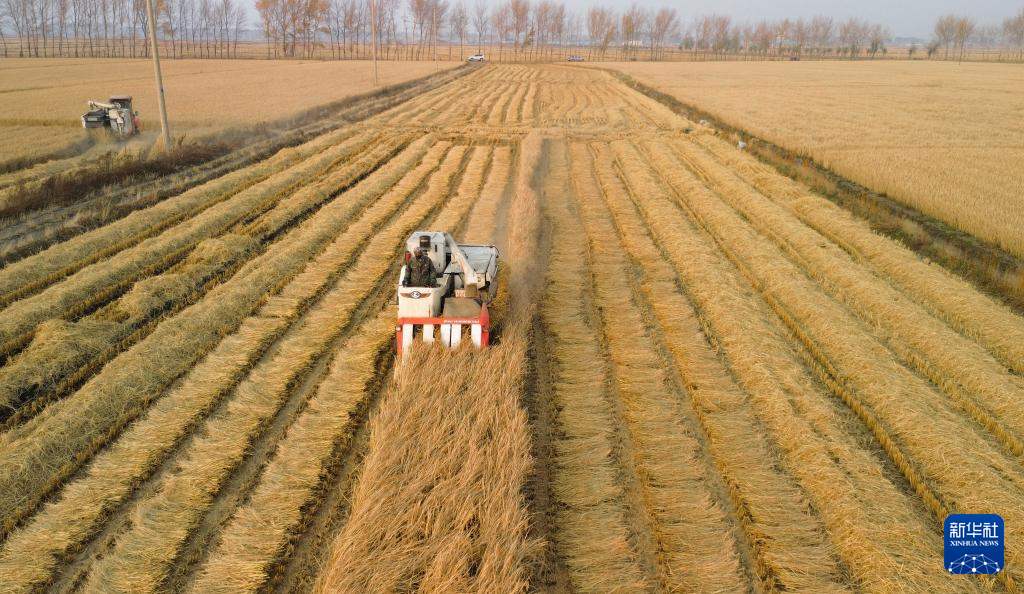 10月25日,收割机在沈阳市沈北新区张家村的稻田中收割水稻(无人机照片)。新华社记者 陈为 摄
