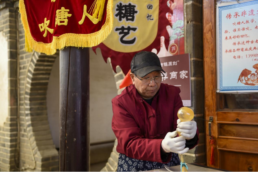 吹糖人的胡师傅摊位前也围满了游客,只见他从热气腾腾的糖锅里揪出一小团麦芽糖,双手快速地揉搓、拉伸,再轻轻一吹,转眼间,一只葫芦造型的糖人就诞生了。