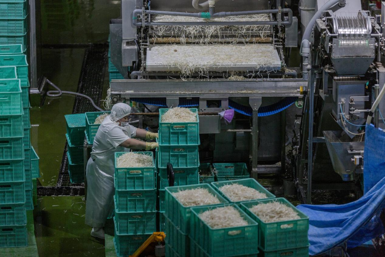 图为福来食品生产车间工人在清洗豆芽。