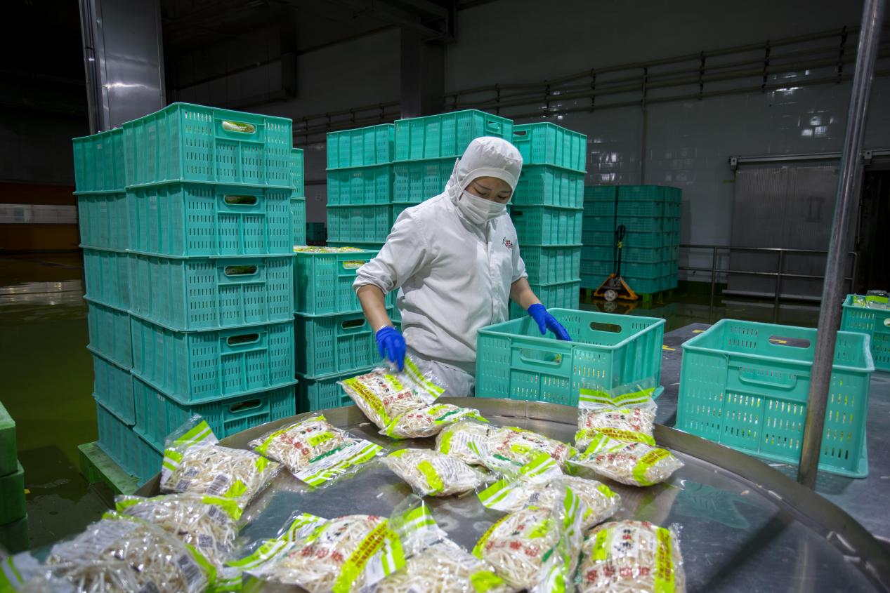 图为福来食品生产车间内,工作人员正在打包产品。