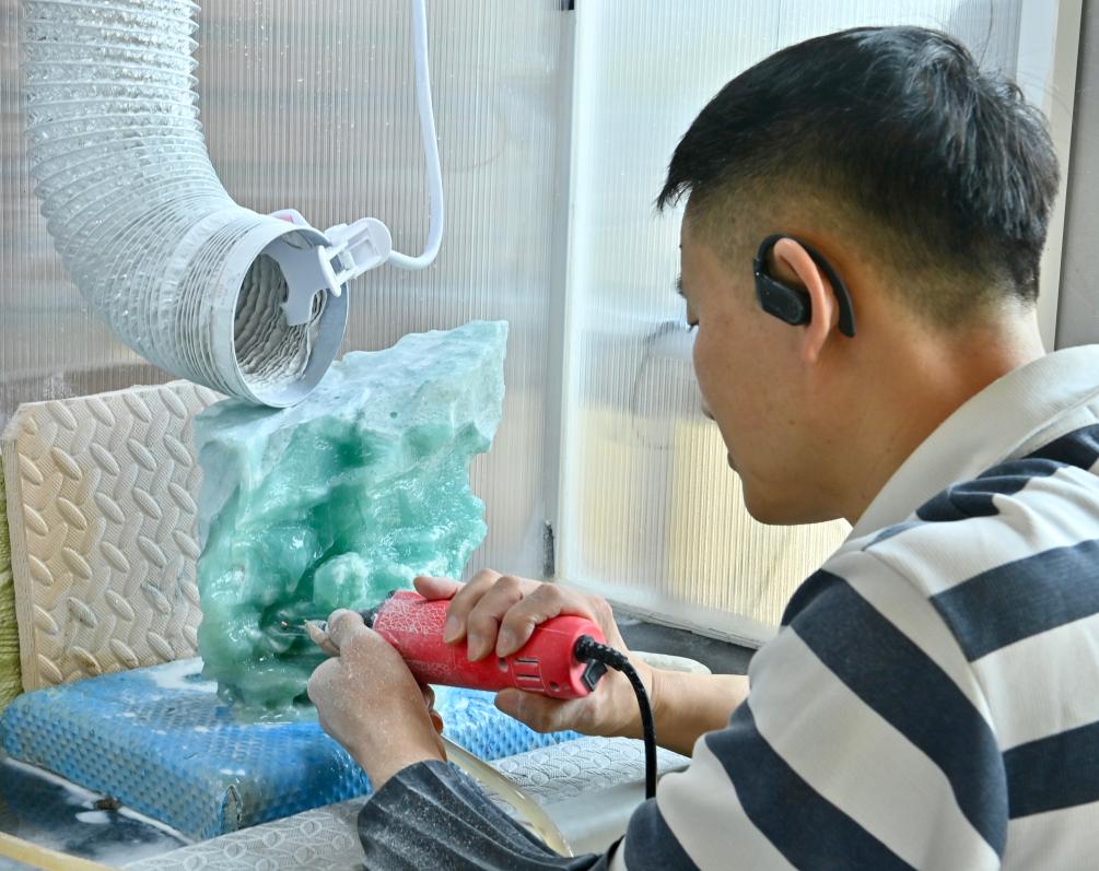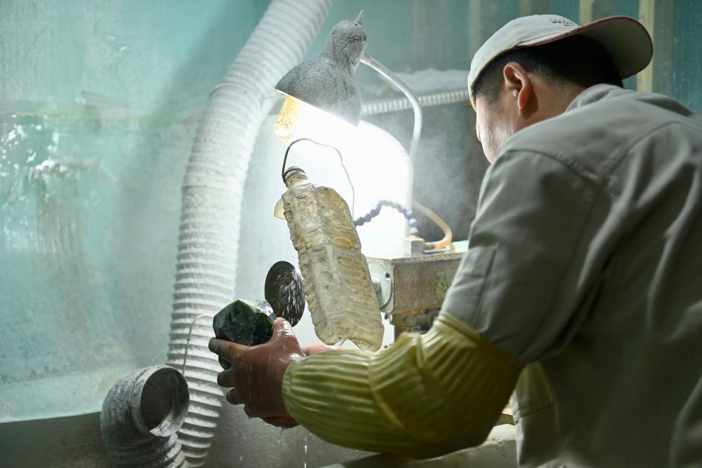 玉雕师在中国玉雕大师创意产业园内打磨玉石。新华社记者 吴青昊 摄