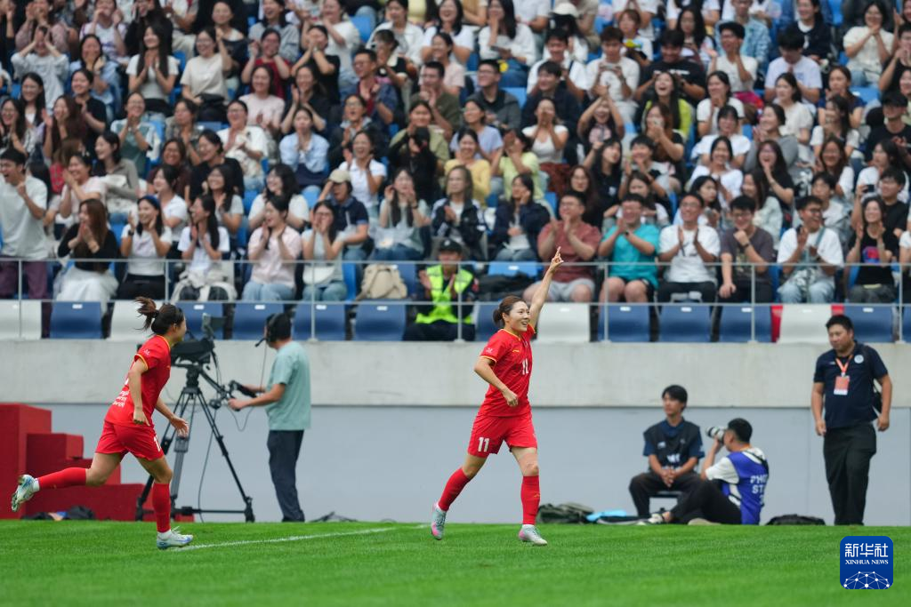 9月27日,上海体育大学女足球员尹丽红(右二)进球后与队友庆祝。新华社记者 郑焕松 摄