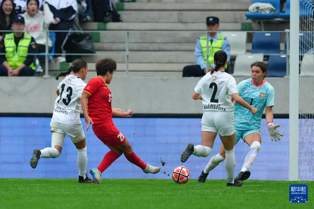 9月27日,拉瓦尔大学女足球员(中)在比赛中破门。新华社记者 郑焕松 摄
