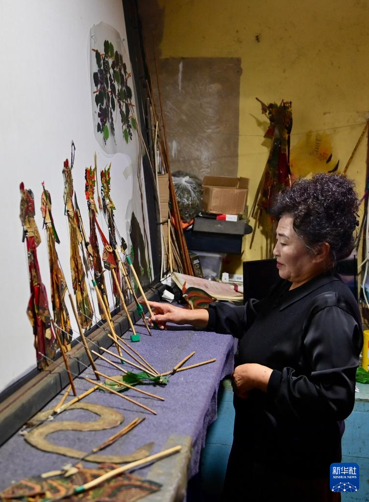 10月13日,宽甸八河川皮影戏第五代传承人王长水的妻子在表演前布置皮影。