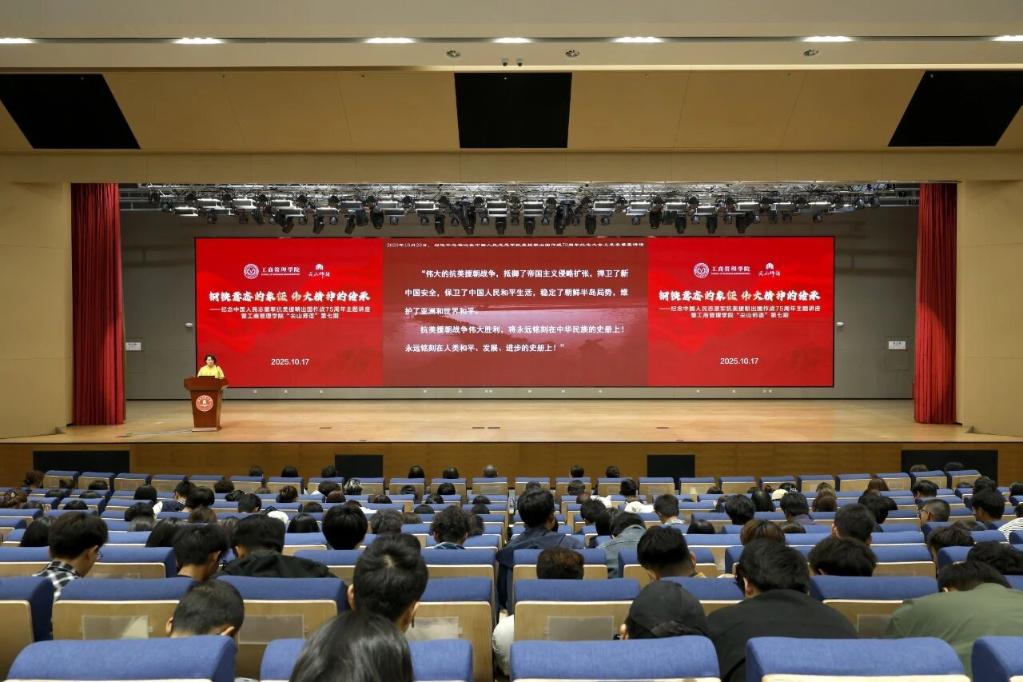 活动期间,抗美援朝纪念馆副馆长、研究馆员张校瑛受邀到校作主题讲座。她以《钢铁意志的象征 伟大精神的传承》为题,围绕“朝鲜内战的爆发”“震撼世界的较量”“奏响胜利的凯歌”“谱写光辉的篇章”四大板块,系统梳理了抗美援朝战争的历史背景与发展脉络,深刻阐释了这场反侵略正义战争的历史意义与时代价值。