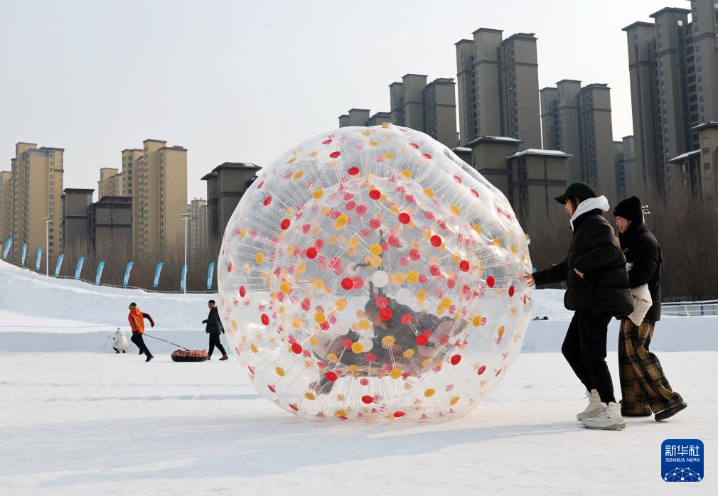 1月9日,游客在沈阳市一家温泉度假酒店体验雪上趣味项目。