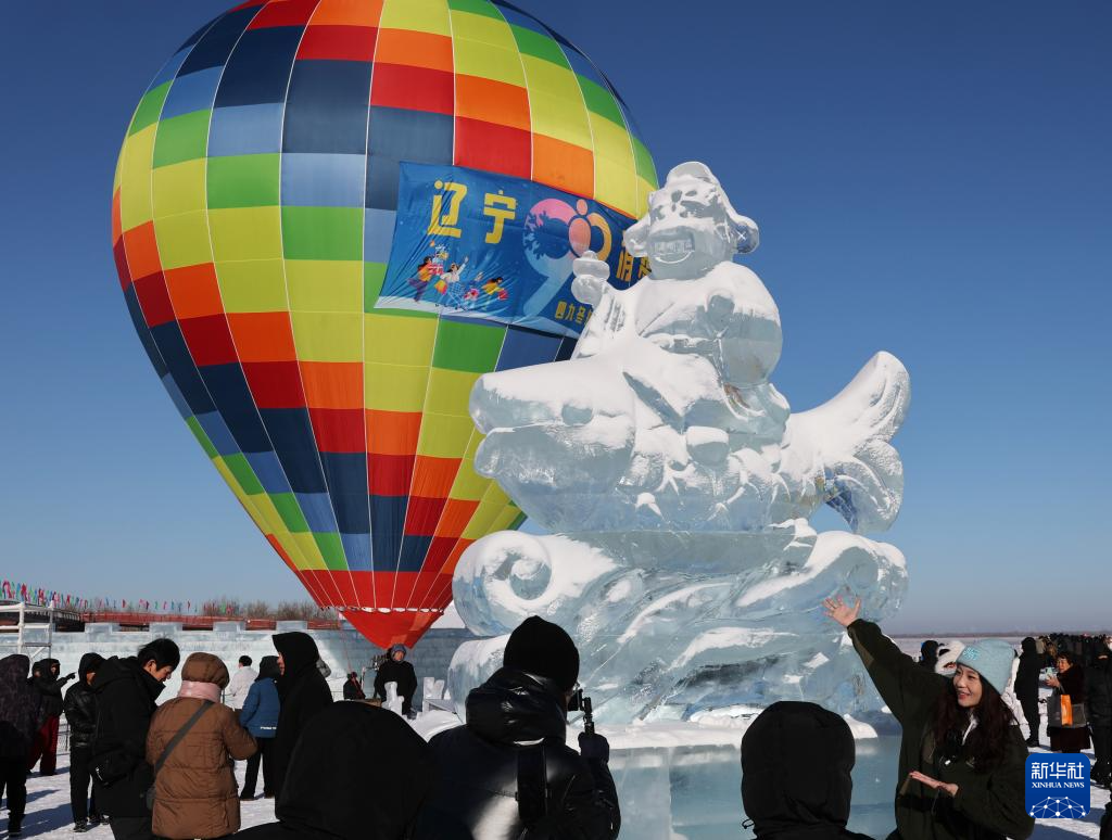 1月24日,在2026第十一届沈阳卧龙湖冬捕季活动现场,游客在冰雕前打卡拍照。