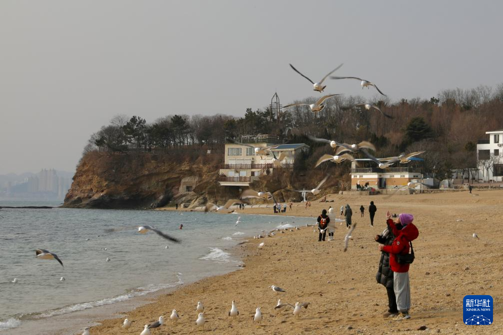 冬日里,在辽宁省大连市海滨,成群的海鸥聚集栖息,吸引游人前来观赏。