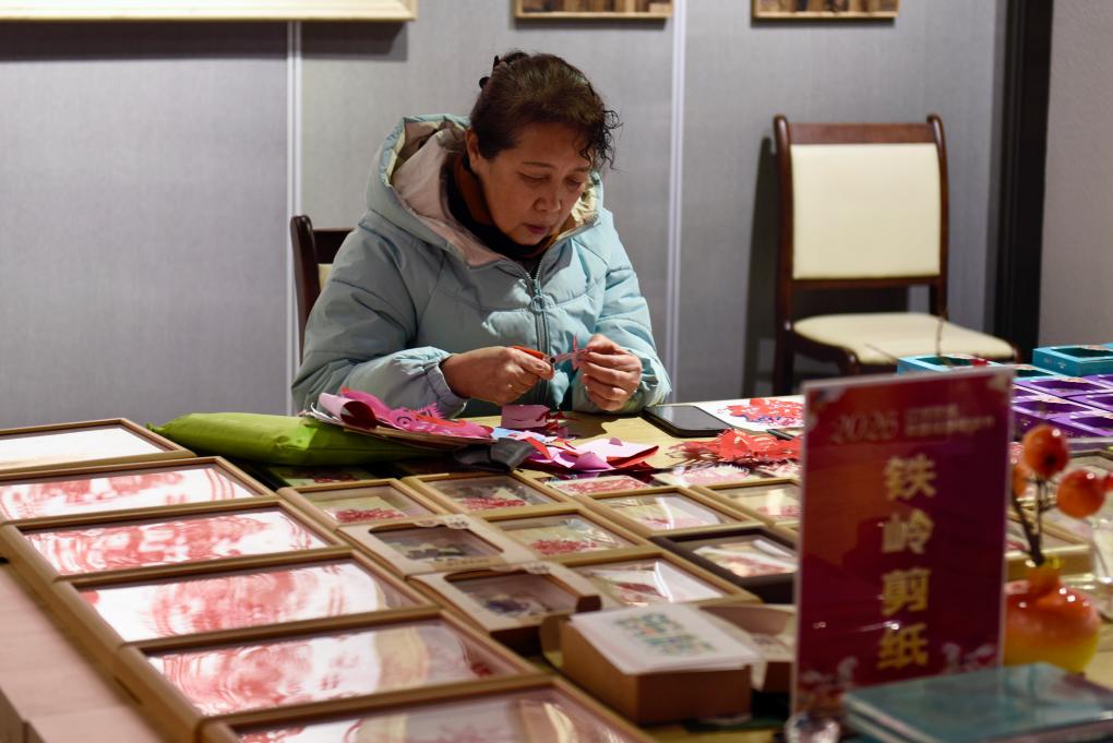 2月3日,一名手工艺人在铁岭博物馆展示铁岭剪纸技艺。