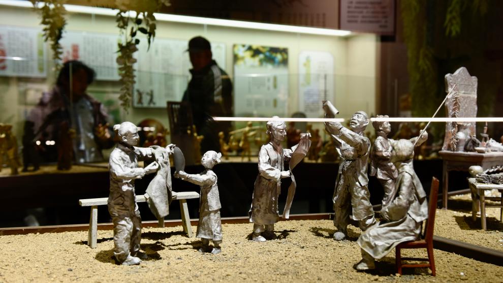 2月3日,一名手工艺人(左)在铁岭博物馆展示北派烙画技艺。