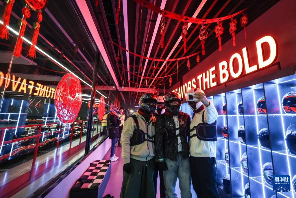 2月12日,游客在沈阳粮仓文化创意产业园准备体验室内卡丁车项目。