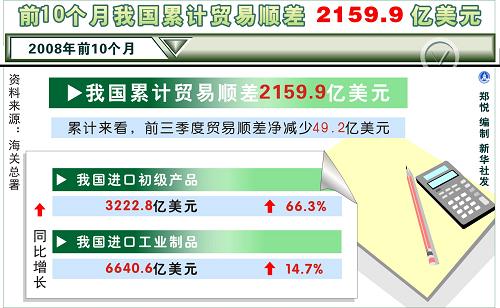 前10月我国顺差2159.9亿美元